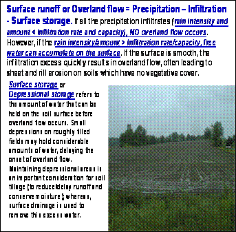 Surface storage or depressional storage refers to the amount of water that can be held on the soil surface before overland flow occurs, and small depressions on roughly tilled fields may hold considerable amounts of water, delaying the onset of overland flow. Infiltration-excess runoff depends on the soil's infiltration rate, and may occur anywhere in the landscape where soils with low infiltrability occur. Infiltration-excess type runoff rarely occurs on the coarser textured soils or in soils with extensive macropore development. When the amount of rainfall is greater than the cumulative infiltration capacity of the soil, infiltration ceases and the excess free water accumulates at the soil surface as a result of saturation-excess. Soils with shallow impermeable layers or poorly drained soils where water tables are close to the surface have limited cumulative infiltration capacity, and are thus quickly vulnerable to saturation-excess runoff. Saturation-excess runoff is not sensitive to rain intensity or soil type (infiltration rate), but depends on where the saturated areas occur in the landscape. Water that infiltrates and is in excess of the soils available water holding capacity is subject to seepage flow or groundwater runoff. In flat landscapes this excess water causes a rise in the water table, saturates the soil and this saturation-excess recharges and fills streams, or eventually leads to flooding conditions. In sloping landscapes, the excess deep percolation also raises water tables, concentrating the water to lower portions of the landscape and recharging streams. In sloping landscapes where the subsoil is comprised of layers which conduct water at different rates, interflow above the lesser conductive layers redistributes water laterally to lower parts of the landscape, saturating low lying areas and in some situations producing springs.