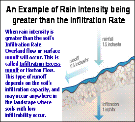 Runoff Surface runoff or overland flow occurs when the soil cannot infiltrate water fast enough or when infiltration ceases, and there is no further capacity to store the water near the soil surface. When the rain intensity is greater than the soils infiltration rate, the excess free water accumulates at the soil surface. This infiltration-excess may quickly result in overland flow if there is no vegetation or surface depressions that help store it, and the soil surface is sloped. A vegetative cover on the soil is very important to intercepting and dispersing the raindrop impact energy of high intensity rainfall events and in slowing the movement of overland flow when it occurs, but a thick vegetation mat or sod thatch can also provide some water storage.