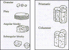 Soil Texture and Structure The size and percentage of individual soil particles determines a soil's texture, but when the bulk arrangement of these particles is considered, the term structure is used. The clustering or aggregation of primary soil particles into compound particles of naturally formed peds or separate soil aggregates can greatly modify the textural influence on soil air and moisture relationships. The soil texture and structure fundamentally determines the number and sizes of soil pores, which will influence the fate and transport of air (gas) and water exchange. Various soil forming processes lead to natural structural features, and soil scientists classify these into the types shown below. Pores exist around these structure types, and some (i.e., crumb, subangular blocky) will also contain smaller micro-pores within the aggregate or ped. A platy structure usually impairs permeability because the horizontal plates often overlap, but a blocky structure may lead to even larger pore sizes than would be found between individual soil particles. The blocky structure is important in clay soils, and is generally what provides the drainable porosity. |