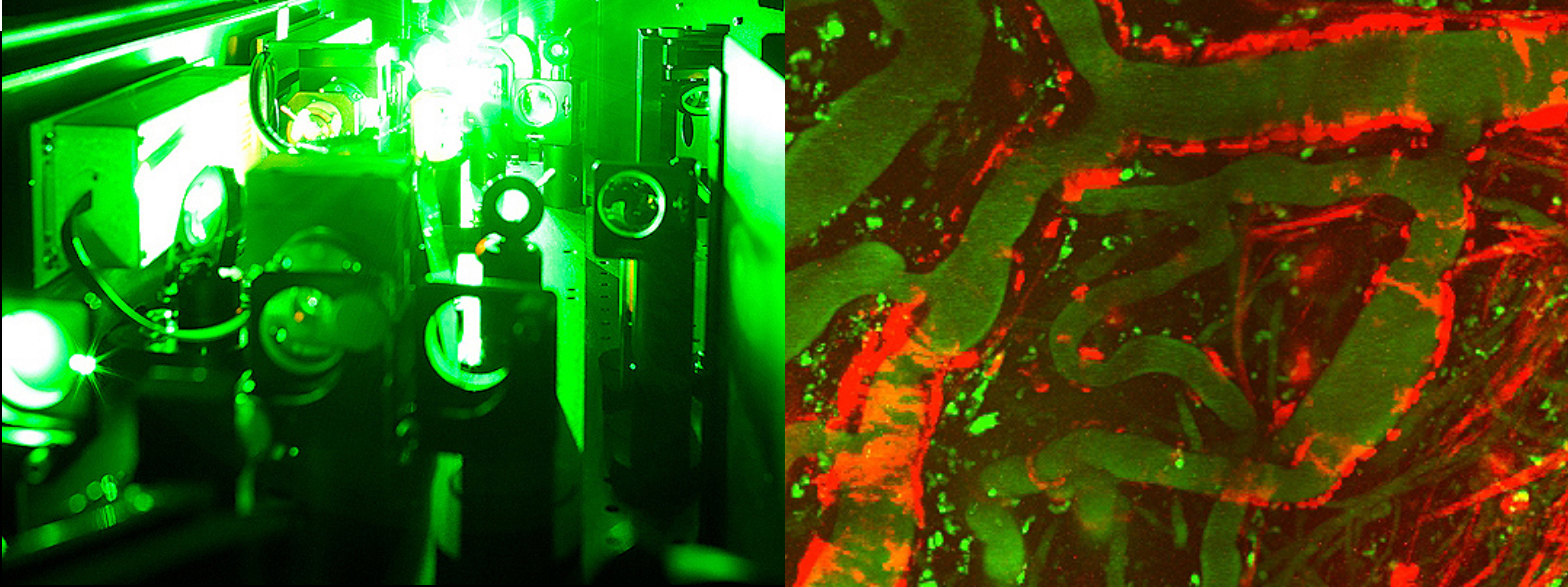 Our lab is interested in studying the contribution of multiple physiological systems to disease initiation and progression, with applications in neurodegenerative disease, cardiovascular disease, and cancer. We would like to understand how the vascular, immune, inflammatory systems and cells native to a tissue interact in these diseases. A major challenge in such work is that model systems such as cell culture or even organotypic tissue culture cannot fully recapitulate all the different cell types involved in disease, so in vivo studies are required. However, it is experimentally difficult to study and manipulate cell-level dynamics in live animals. Recently, we have worked to develop technologies such as improved imaging using multiphoton microscopy that work in whole animals and have sufficient spatial and temporal resolution to quantify cellular dynamics. We also now have tools, femtosecond laser ablation, to produce targeted disruption with cellular-scale precision.